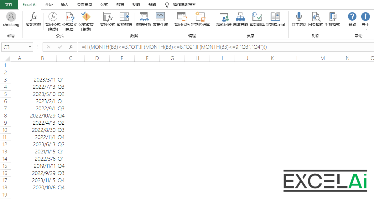 - 在上方的问题栏中填写您的目标需求,例如:根据A1的日期判断其所属的季度